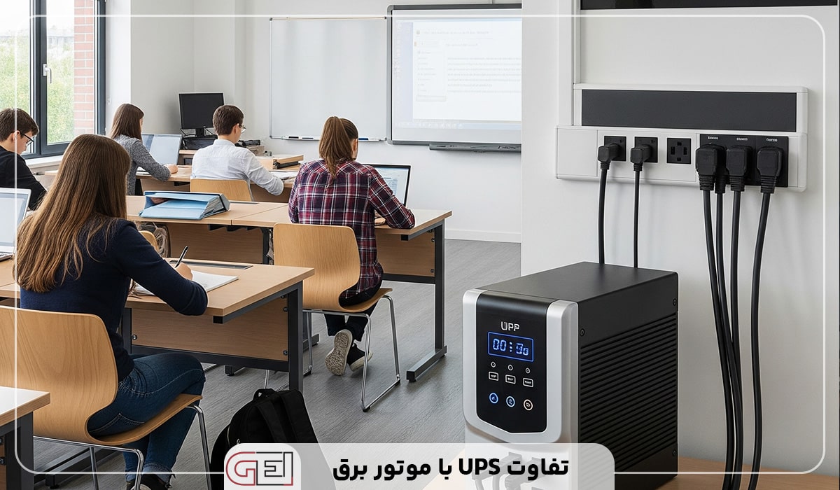 - سر و صدا و آلودگی: UPS بیصدا و بدون دود است، در حالی که موتور برق سر و صدا و آلایندگی دارد و برای محیط کلاس مناسب نیست.