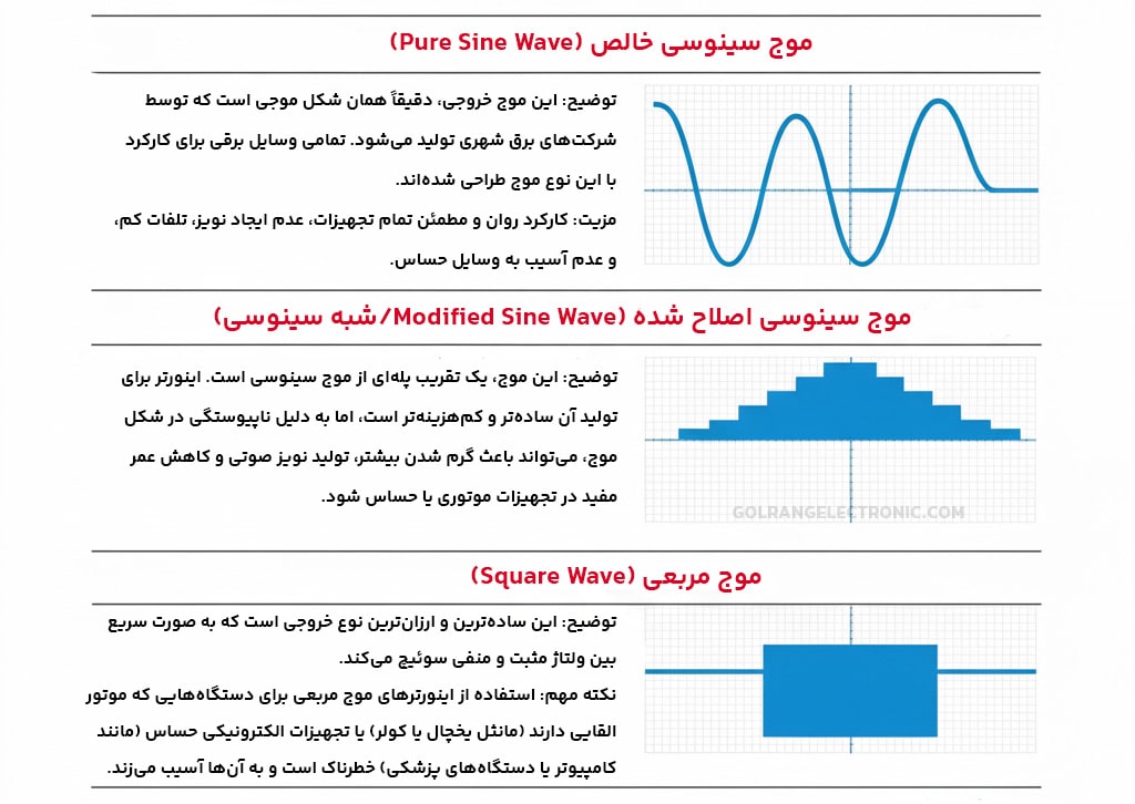 نکته: استفاده از موج نامناسب میتواند به موتور و تجهیزات آسیب بزند یا بازده انرژی را کاهش دهد.